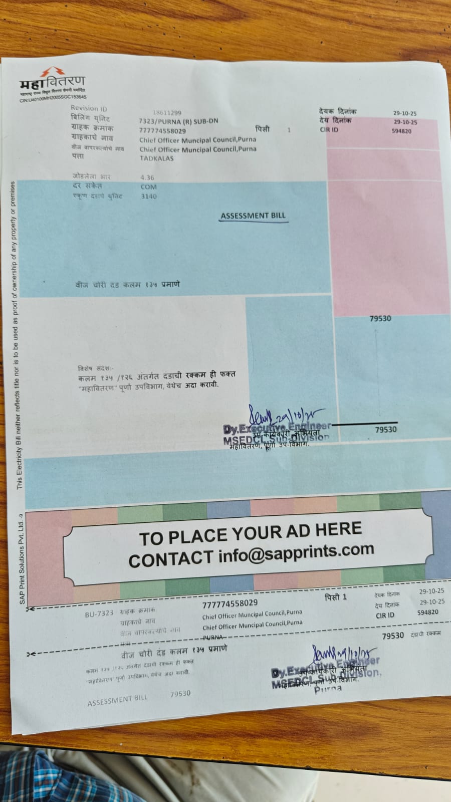 पुर्णा,दि.५(प्रतिनिधी) महावितरणच्या कारभारातील ढिसाळपणा, ठेकेदारांस पाठीशी घालण्यासाठी सुरू केलेला संगनमताचा खेळ आणि या प्रकरणी वरिष्ठ अधिकारी वर्गाचा थंड निष्क्रियपणा या त्रिसंधीने पुर्णा शहरात वीजचोरीचे प्रकरण अक्षरशः गाजवले आहे. आकडेखोर ठेकेदाराने उघडपणे वीजचोरी करून महावितरणला चुना लावला,पण महावितरणच्या अधिकाऱ्यांनी मात्र कारवाई ऐवजी ‘थातुरमातुर नाटक’ रचून प्रकरण दाबण्याचा प्रयत्न सुरू ठेवला. धक्कादायक म्हणजे या चोरीचे बील ठेकेदाराऐवजी थेट मुख्याधिकाऱ्यांच्या नावावर फाडल्याची माहिती पुढे …