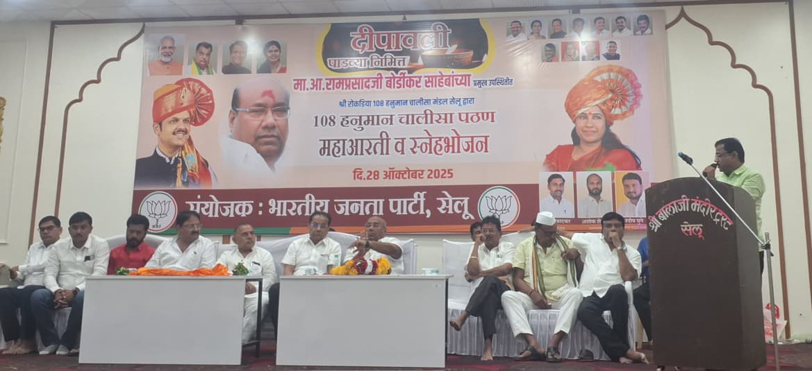 सेलू / प्रतिनिधी – दीपावली पाडव्यानिमित भारतीय जनता पार्टी शाखा ,सेलू च्या वतीने १०८ हनुमान चालीसा पठण ,महाआरती व स्नेह भोजन कार्यक्रमाचे आयोजन दि २८/१० /२५ मंगळवार रोजी करण्यात आले होते. बालाजी मंदिर मंगल कार्यालयात आयोजित या कार्यक्रमासाठी प्रमुख मार्गदर्शक म्हणून माजी आमदार रामप्रसादजी बोर्डीकर यांची उपस्थिती होती .तर बाजार समितीचे सभापती डॉ संजय रोडगे ,माजी जी प सभापती …